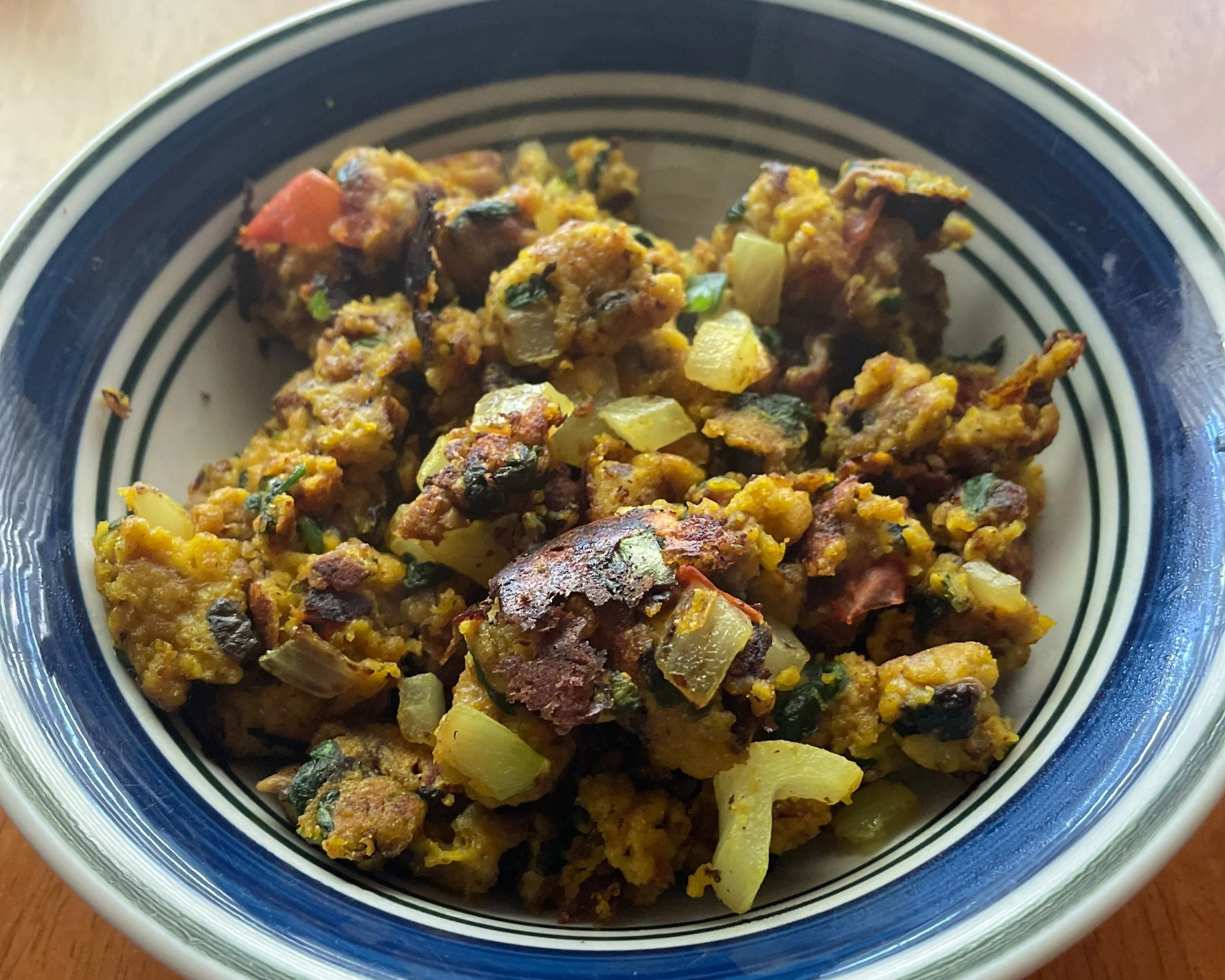 Pour the chickpea flour dough into over the veggies and into the pan and allow to sit for 2-3 minutes, like you would a regular scramble or omelet until the edges begin to dry out.
