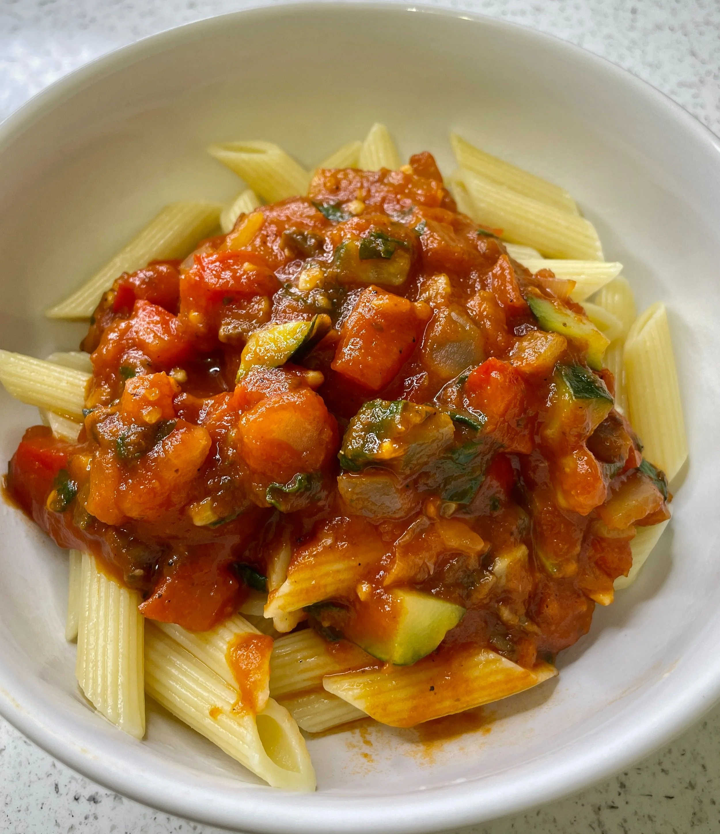 Serve veggies and sauce over a bed of pasta with a good dusting of vegan almond parmesan.